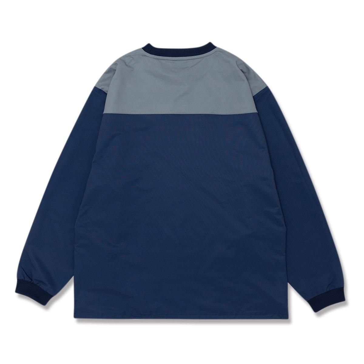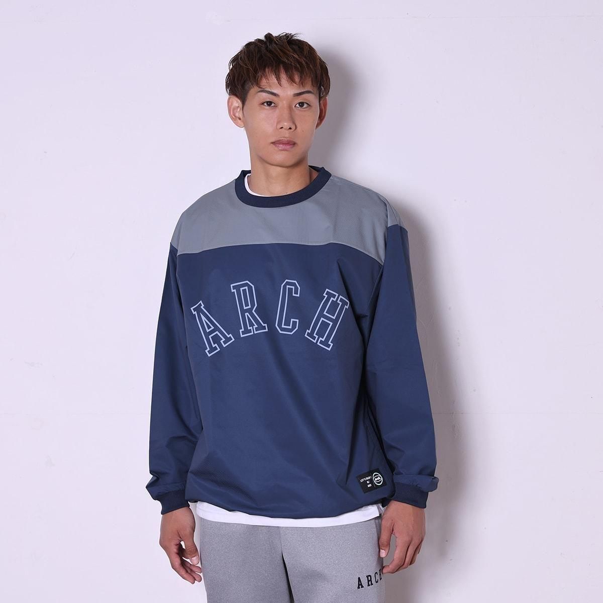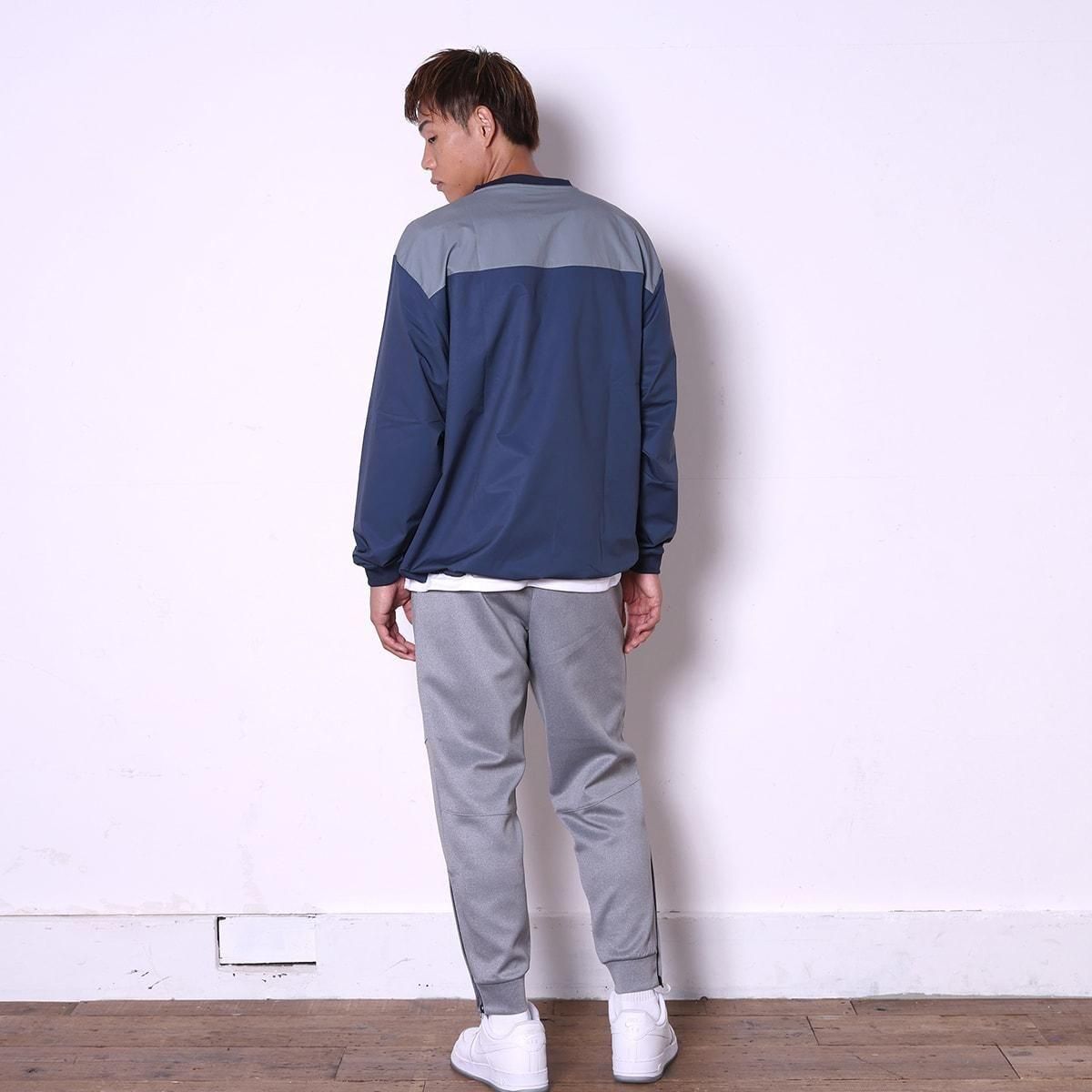 ・カラー:ネイビー ・素材: ポリエステル100% カレッジ調のロゴをフロントにビッグサイズでプリントしたウインドクルーネックシャツ。 ・着心地のよいハニカムメッシュのポリエステル素材を採用。 ・着脱が簡単で、ズボッとカブれるゆったりめのシルエット。 ・サイドポケット付きで、デイリーユースのアウターとしても活躍。 ・裾はドローコード付で、保温調整と好みのシルエットへの調節が可能。 バリエーションは、ブラック、ネイビー、モーブの3色を用意。 モデル:身長190cm 着用サイズ:トップスXXL、ボトムスXXL