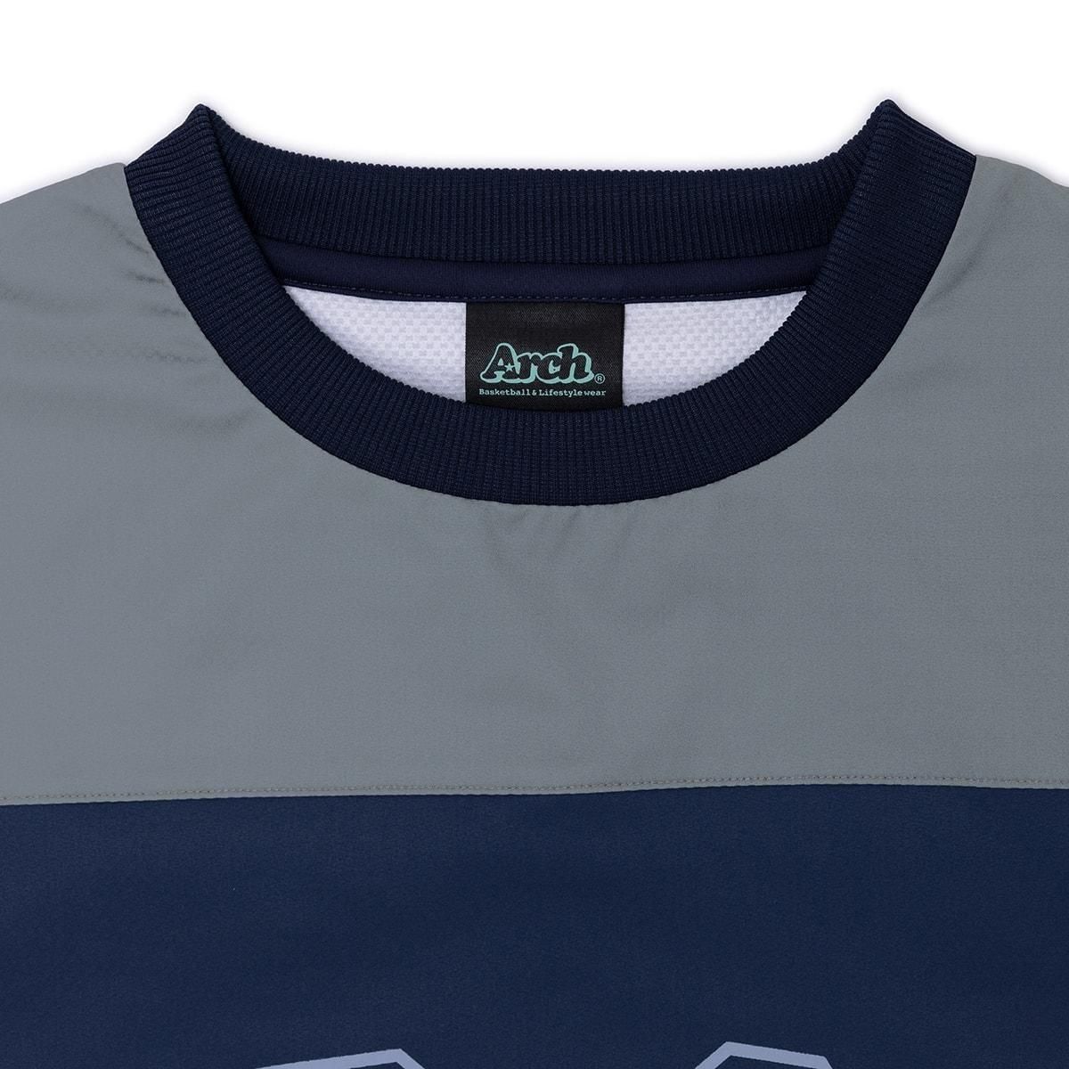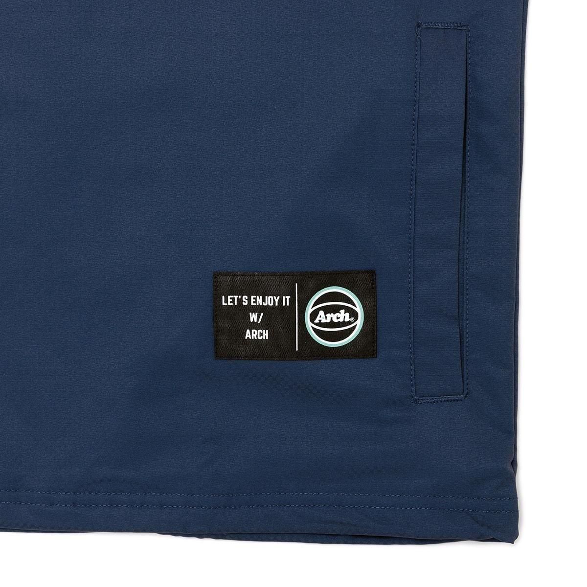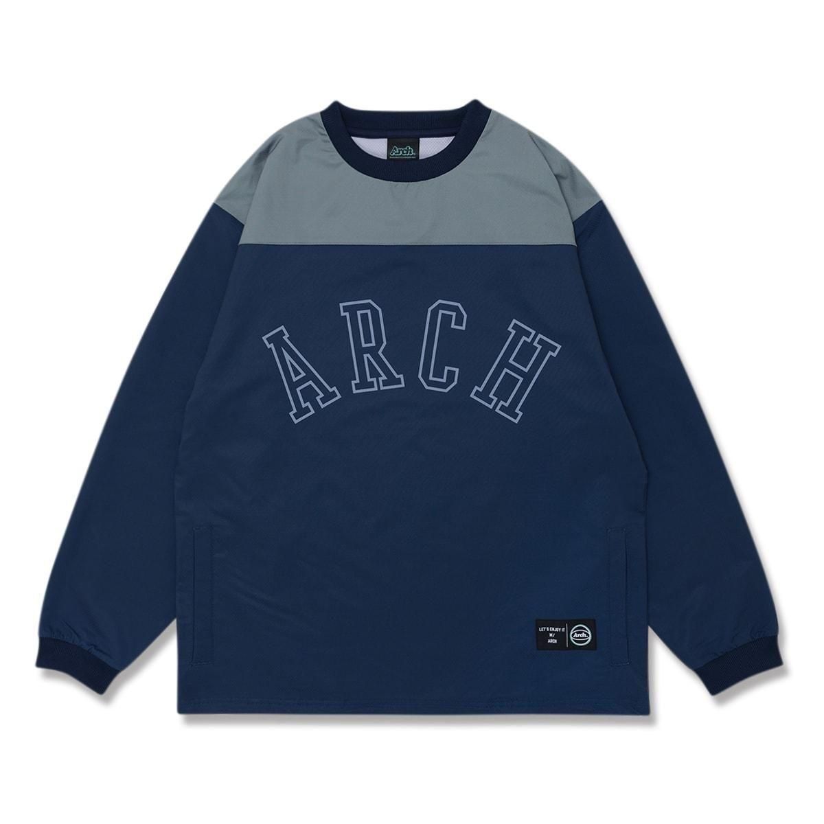 ・カラー:ネイビー ・素材: ポリエステル100% カレッジ調のロゴをフロントにビッグサイズでプリントしたウインドクルーネックシャツ。 ・着心地のよいハニカムメッシュのポリエステル素材を採用。 ・着脱が簡単で、ズボッとカブれるゆったりめのシルエット。 ・サイドポケット付きで、デイリーユースのアウターとしても活躍。 ・裾はドローコード付で、保温調整と好みのシルエットへの調節が可能。 バリエーションは、ブラック、ネイビー、モーブの3色を用意。 モデル:身長190cm 着用サイズ:トップスXXL、ボトムスXXL