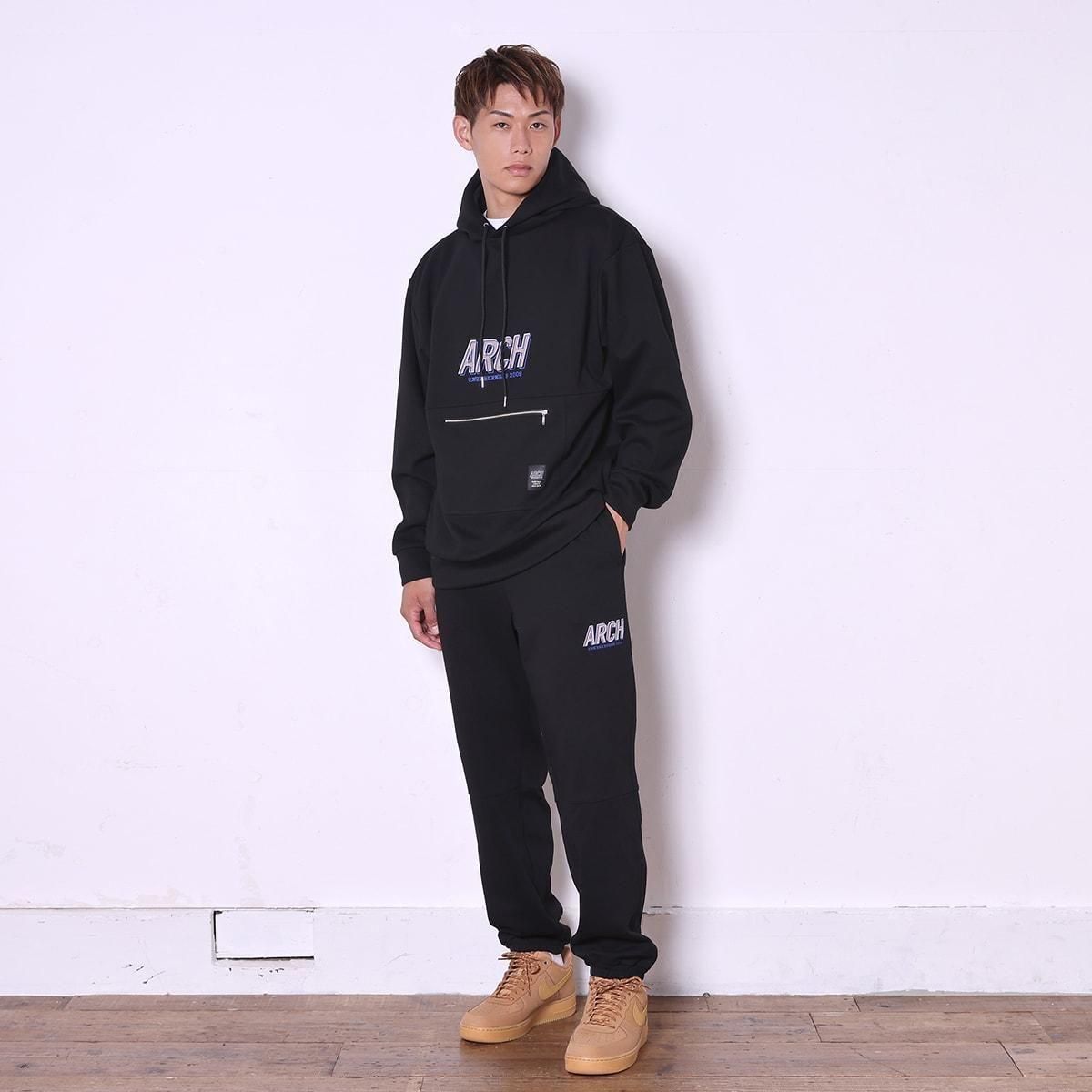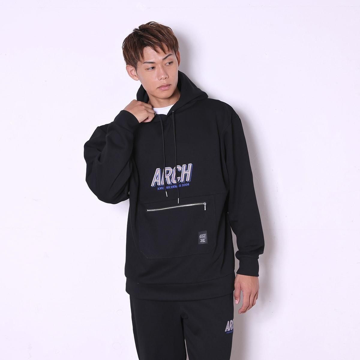 スポーティーなグラフィックロゴをプリントと刺繍で施したスウェットプルオーバーパーカ。