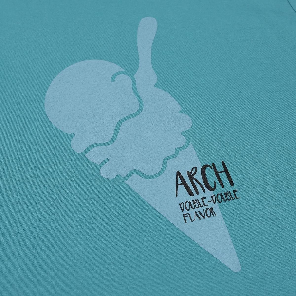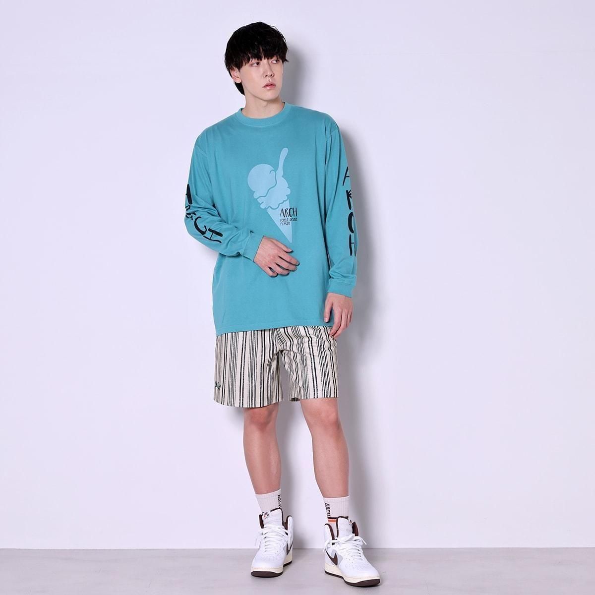 ・カラー:ダークシアン ・素材:コットン100% Archのアイコニックスウィーツであるアイスクリームを描いた、コットン素材のL/S Tシャツ。 アイスのグラフィックをフロントに同系カラーでプリントし、両袖にもロゴをプリントした大胆なデザイン。 ポップなストリートスタイルが、タウンユースのコーディネートにもおすすめ。 バリエーションはアッシュグレー、ブラック、ダークシアンの3色を用意。 モデル:身長188cm 着用サイズ:トップスXXL、ボトムスXL