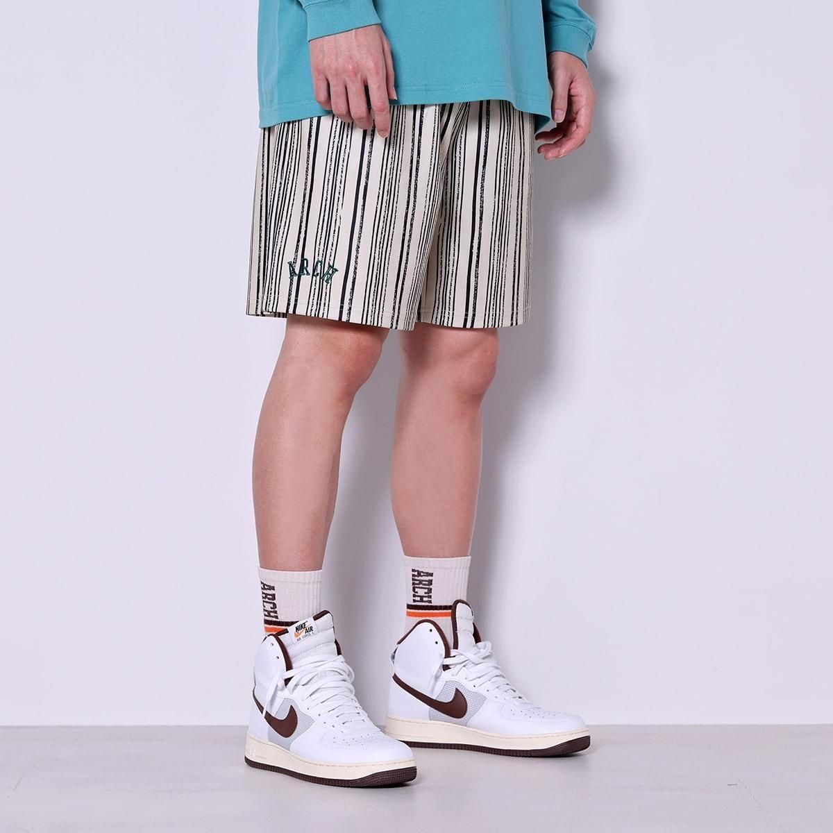 ・カラー:サンド ・素材:ポリエステル100% 独特なタッチでかすれさせたストライプ柄を全面にあしらったショーツ。 モダンテイストなデザインが、さまざまなコーディネートを引き立たせる。 軽量で履き心地がよく、程よい厚みの柔らかいポリエステル素材を採用。 バリエーションはブラック、サンド、スモーキーピンクの3色を用意。 モデル:身長188cm 着用サイズ:トップスXXL、ボトムスXL