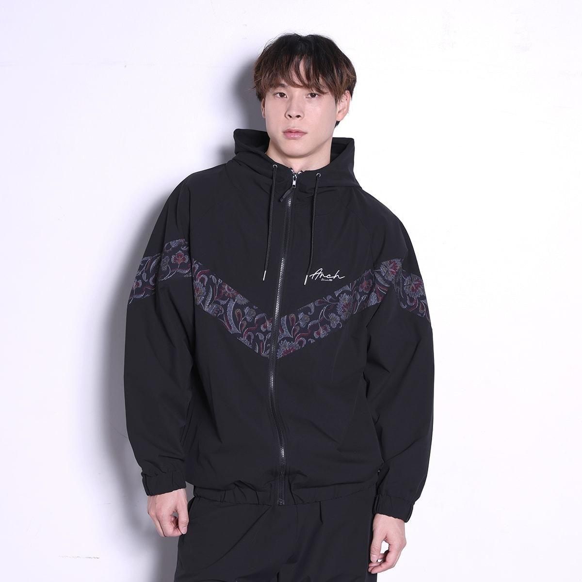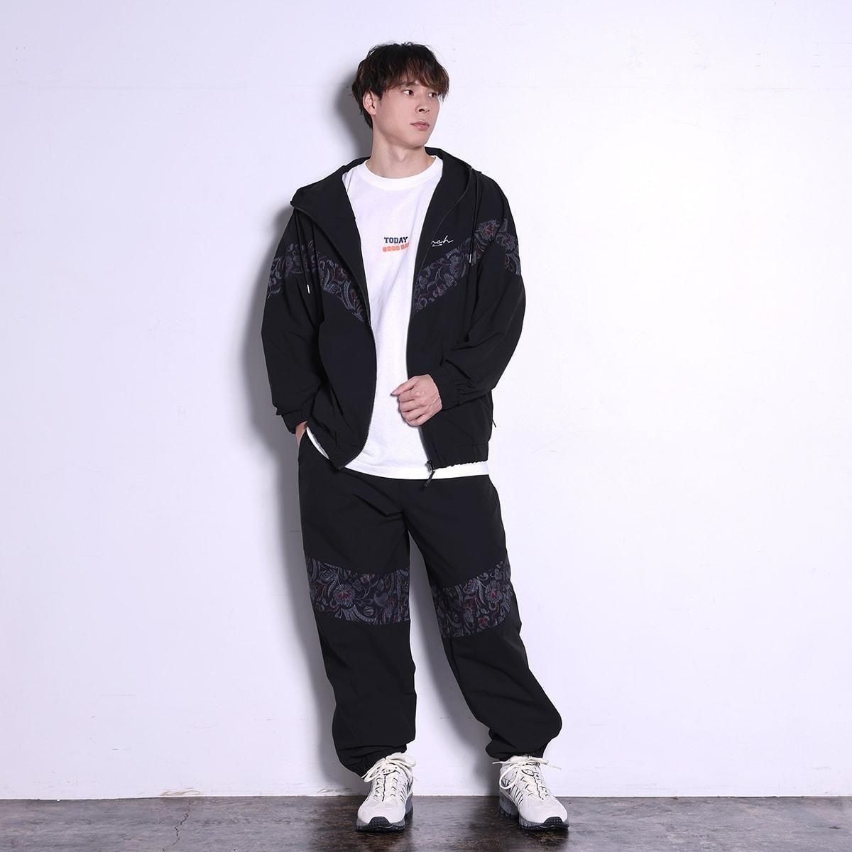 ・カラー:ブラック ・素材: ポリエステル100% 絵画のように複雑な模様の伝統的な織物技法「ゴブラン織」をモチーフにしたデザインをラインで配置した、高品質のトラックジャケット。 スポーティーなスタイルにアンティーク調のクラシカル感をプラスした、幅広いシーンで着用できるアイテム。 ・軽量でマットな質感のポリエステル素材を採用。 ・オールシーズンにサラリと着られるよう、あえて裏地のメッシュライナーを排除。 ・フロント両サイドにファスナー付ポケットを装備。 ・裾部分はゴム仕様で、ゆったりとした着心地ながら防寒性も良好。 ・カジュアルさを演出するワイドシルエットを採用。 同シリーズの【gobelin fabric collection】とコーディネートが楽しめる。 バリエーションはオフホワイト、ブラック、オリーブの3色を用意。 モデル:身長183cm 着用サイズ:トップスXL、ボトムスXXL