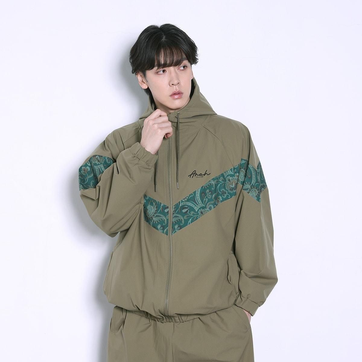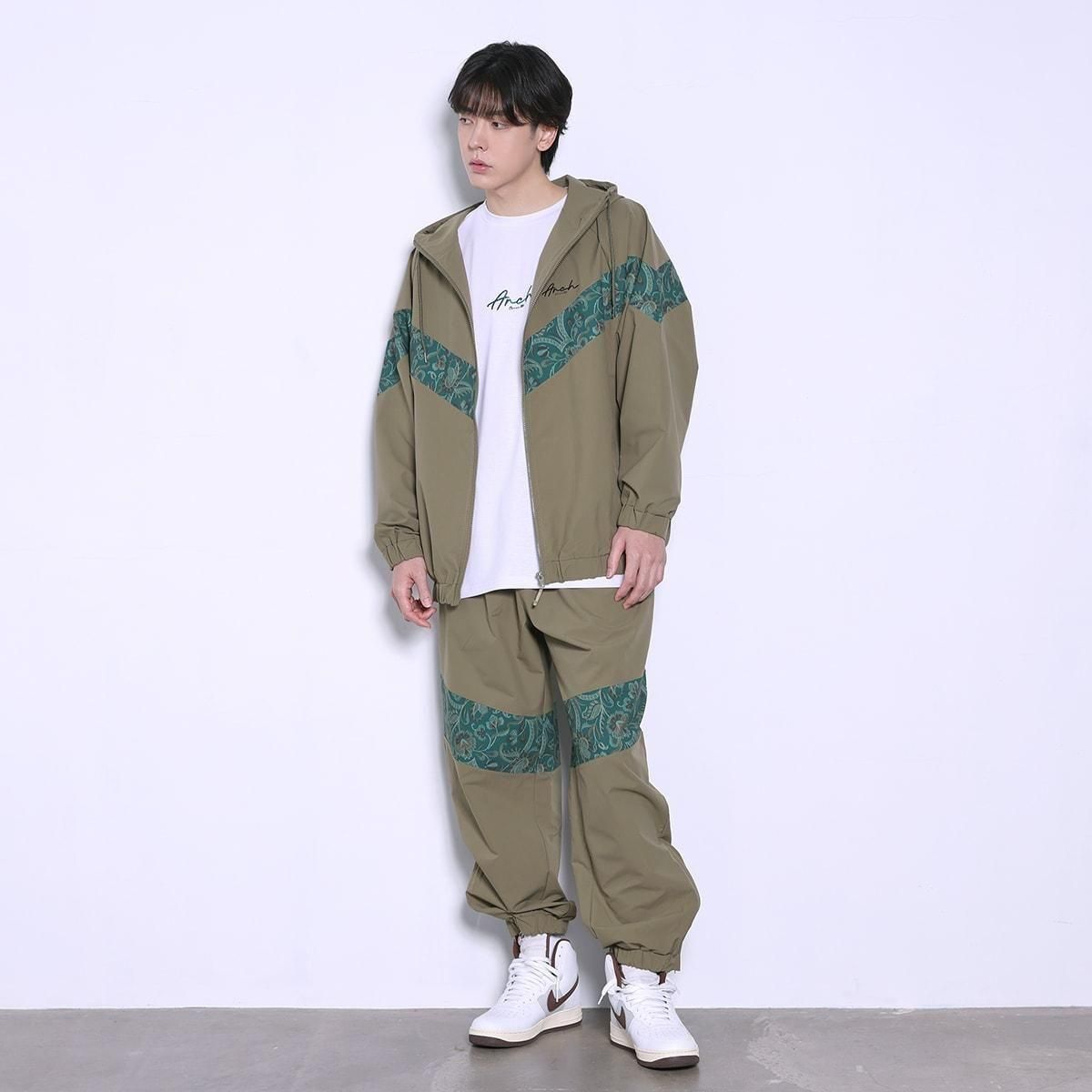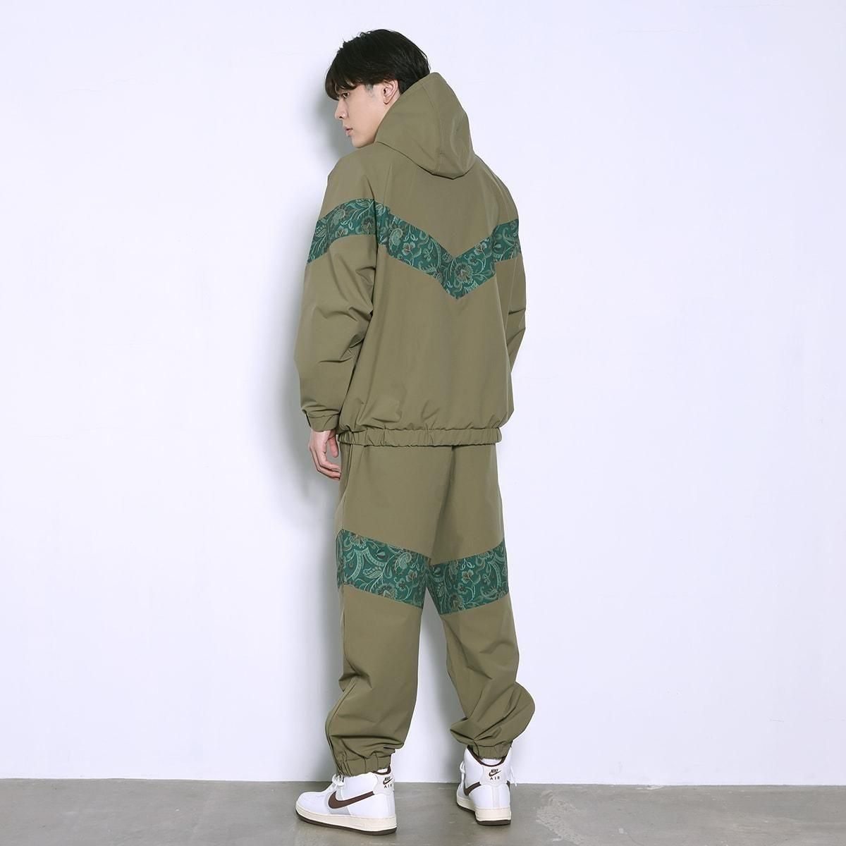 ・カラー:オリーブ ・素材: ポリエステル100% 絵画のように複雑な模様の伝統的な織物技法「ゴブラン織」をモチーフにしたデザインをラインで配置した、高品質のトラックジャケット。 スポーティーなスタイルにアンティーク調のクラシカル感をプラスした、幅広いシーンで着用できるアイテム。 ・軽量でマットな質感のポリエステル素材を採用。 ・オールシーズンにサラリと着られるよう、あえて裏地のメッシュライナーを排除。 ・フロント両サイドにファスナー付ポケットを装備。 ・裾部分はゴム仕様で、ゆったりとした着心地ながら防寒性も良好。 ・カジュアルさを演出するワイドシルエットを採用。 同シリーズの【gobelin fabric collection】とコーディネートが楽しめる。 バリエーションはオフホワイト、ブラック、オリーブの3色を用意。 モデル:身長188cm 着用サイズ:トップスXXL、ボトムスXXL