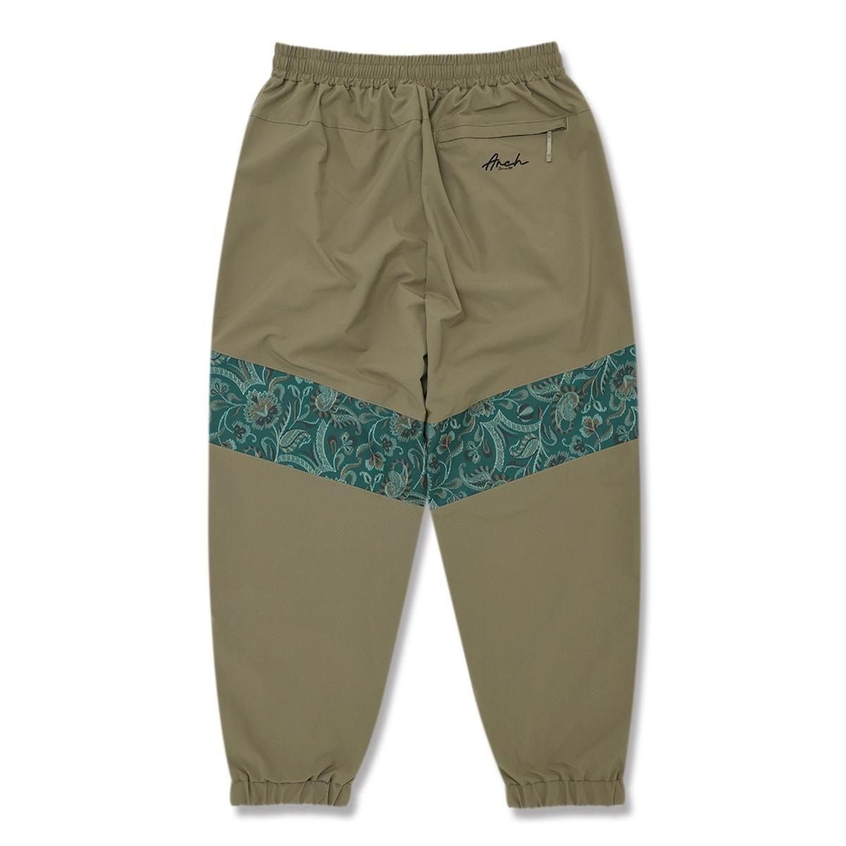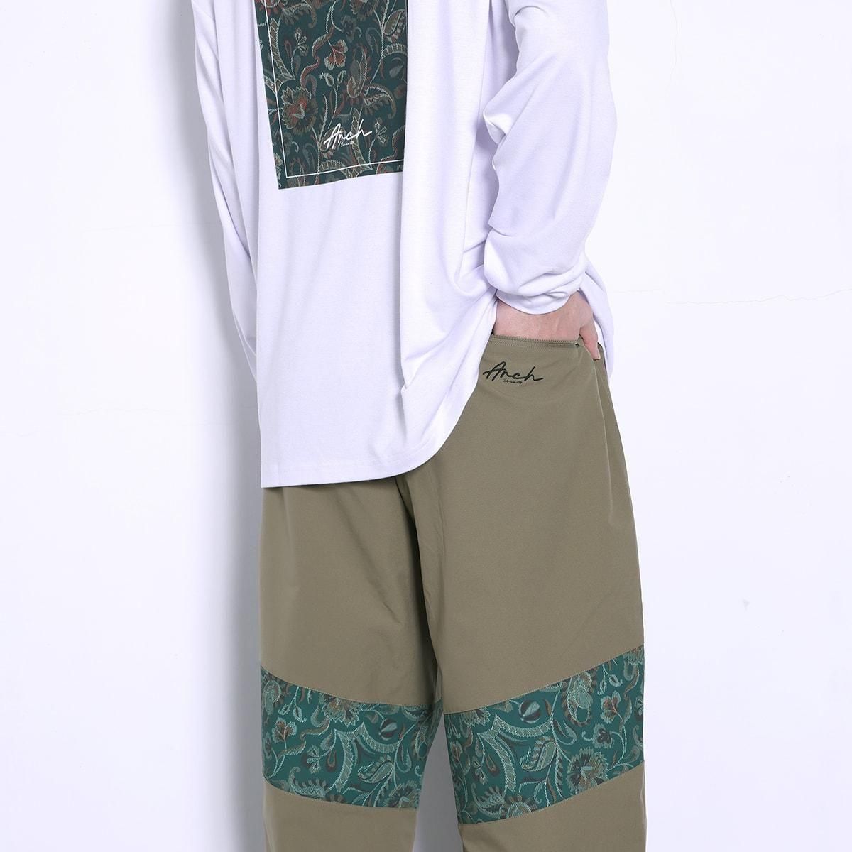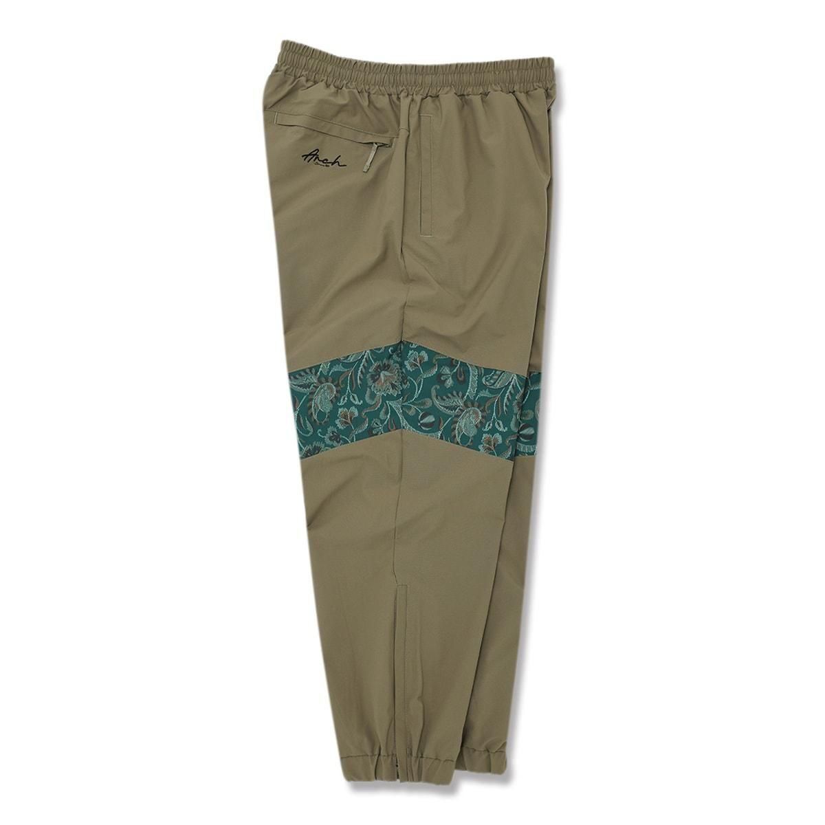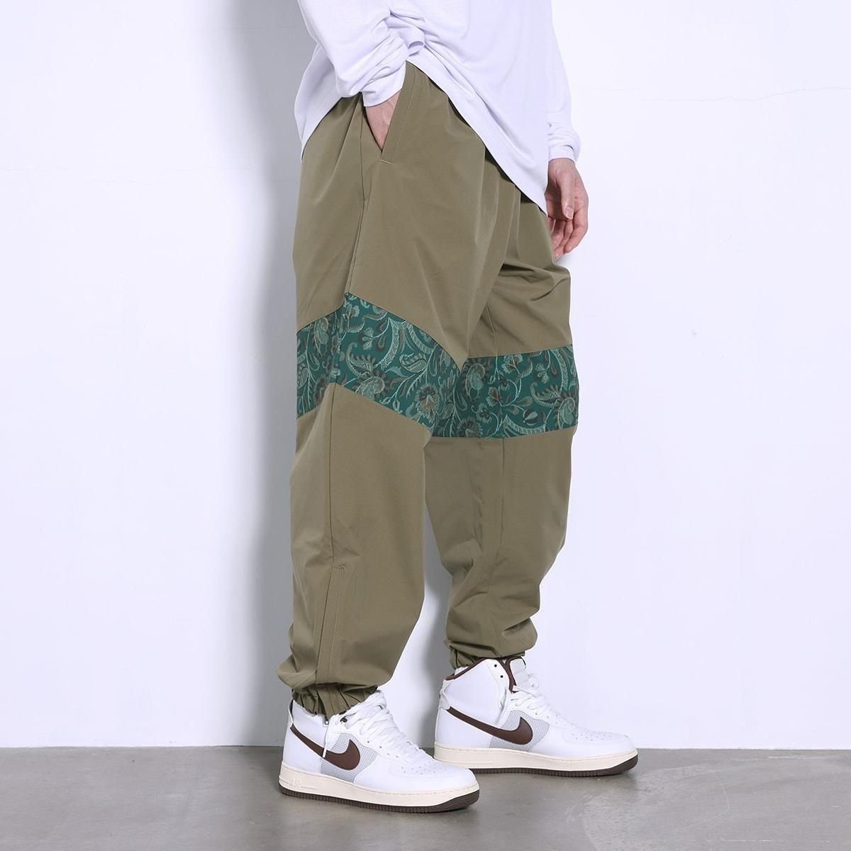 ・カラー:オリーブ ・素材:ポリエステル100% 絵画のように複雑な模様の伝統的な織物技法「ゴブラン織」をモチーフにしたデザインをラインで配置した、高品質のトラックパンツ。 スポーティーなスタイルにアンティーク調のクラシカル感をプラスした、幅広いシーンで着用できるアイテム。 ・軽量でマットな質感のポリエステル素材を採用。 ・オールシーズンにサラリと着られるよう、あえて裏地のメッシュライナーを排除。 ・裾はゴム仕様で保温性に優れ、、サイドにはファスナー付で脱着もスムーズ。 ・バックにはファスナー付ポケットを装備。 ・カジュアルテイストを取り入れた、ゆったりシルエットを採用。 同シリーズの【gobelin fabric collection】とコーディネートが楽しめる。 バリエーションはオフホワイト、ブラック、オリーブの3色を用意。 モデル:身長188cm 着用サイズ:トップスXXL、ボトムスXXL